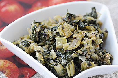 - מטגנים במחבת עם שמן את הבצל, על אש בינונית עד קטנה, עד שהוא מקבל צבע של קרמל. כשהבצל מקורמל, מוסיפים את עלי המנגולד ומטגנים אותם עד שכל הנוזלים מתאדים. תהליך זה יכול לארוך כשעה עד שעה וחצי.