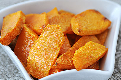 - מקלפים את הדלעת ופורסים לפרוסות בעובי של 1/2 ס"מ.