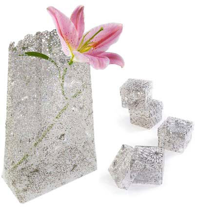 בצילום למטה: צלחות מתכת בדוגמאות תחרה וינטג' ואגרטלים חלולים שמציבים בתוכם כוס שקופה עם פרחים עשויים ממתכת תחרה וקופסאות קטנות למתנות של METALACEART