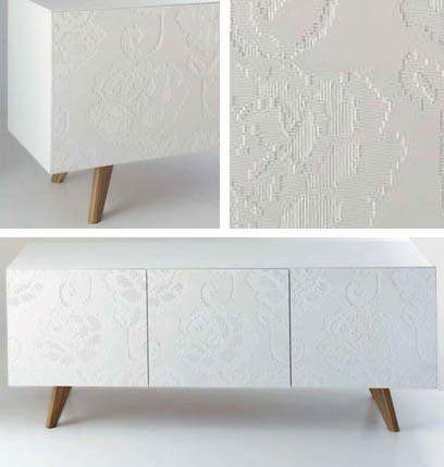 אריחי תחרה שיצר המעצב הבריטי הצעיר Jethro Macey זיכו אותו בפרסי עיצוב נחשקים. מייסי שהטביע דוגמאות של תחרה פרחונית בבטון אפור, הצליח להפיח בחומר התעשייתי האפור, הקר והנדוש מראה רומנטי ודקורטיבי. הוא רתם את המחשב לצורך העברת הטקסטורה המחוררת המעודנת של התחרה כדי להשאיר חותם באריחים המשמשים לחיפוי קירות ורצפה.מייסי השתמש בציפוי דמוי תחרה פרחונית לבנה לצפות ארונית מדיה מעץ והצליח ליצור מראה רומנטי ענוג ברהיט מינימליסטי מודרני.
