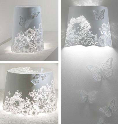 תחרה לבנה של שמלות כלה היתה ללא ספק ההשראה לעיצוב גופי התאורה הלבנים הענוגים של המעצב מתאו יוגוליני (Matteo Ugolini). בחיתוכיי לייזר הוא הצליח ליצור דוגמאות של תחרה קלאסית בצורות של פרחי ורדים ופרפרים בגופי התאורה. חוץ מהמראה הרומנטי של שילוב תחרה בחומר מתועש כמו מתכת, הוא הצליח ליצור משחקי אור וצל דרך חורי התחרה.