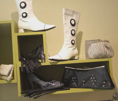 על אחד הקירות תלויה קונסטרוקציית מבוך ובתוכה מוצגים משקפי שמש לצד תיקי קלאץ' ותיקי יד מתקופות שונות. על דלפק המכירה הקטן יש מבחר תכשיטים המשלבים בין ישן לחדש. מתחת לקולבים מציצים זוגות נעלי עקב אופנתיים.
