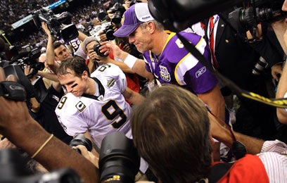 ברט פארב מהווייקינגס מברך את דרו בריז מהסיינטס בסיום (MCT)