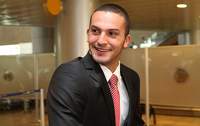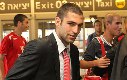 שפע חיוכים בדרך לליסבון. בן סהר בנתב"ג (צילום: עוז מועלם)