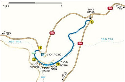 התצפית שבה עצרתם חולשת על אזור נאות הכיכר ודרום ים המלח. מחלקה העליון של התצפית (נקודה 1 במפה) יורד שביל קצר ותלול דרומה, לעבר נחל תמר הנראה למטה. השביל המסומן ירוק יוביל אתכם מהר מאוד בירידה תלולה לערוץ הנחל. בערוץ פונים עם השביל שמאלה (מזרחה), חולפים על פני פיצול שבילים (2) וממשיכים מזרחה במורד.