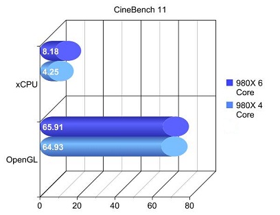 באופן אנומלי משהו, אך מעניין, ה-980 בגירסה מושבתת הליבות, הוציא תוצאה גבוהה יותר מאשר שש הליבות במלואן, אבל בהפרש זניח: 8,848 נקודות. בדקנו את המעבד החדש יותר גם עם Cinebench11. בעיבוד וידאו, לשש הליבות היה יתרון מובהק עם ציון של 8.08 לעומת הפעלה עם ארבע ליבות, שהשיגה רק 4.25.