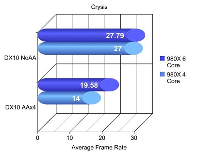 בקרייסיס, ללא AA, קצב הפריימים הממוצע שנמדד היה זהה במצב העבודה עם שש ליבות ועם ארבע – 27 ו27.79 פריימים לשניה. עם AA של פי ארבעה, שש ליבות לעומת ארבע, השיגו 5.8 פריימים יותר בממוצע. הפרש קטן, אך קיים.