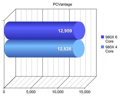 הציונים ב-PCVantage היו דומים: 12,959 ו-12,826 נקודות לשש וארבע ליבות ב-980X, בהתאמה. מה שמאשש את הסברה שבמבחנים סינתטיים לחישוביות, אין לשש הליבות יתרון משמעותי מול ארבע.