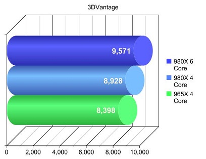 בעזרת מבחן התעשיה הידוע לביצועי תלת ממד, 3DVantage 2010, יכולנו להשוות גם את ביצועי ה-980X לאחיו מרובע הליבות. המבחן הסינתטי מצביע על יתרון משמעותי למעבד שש הליבות. מדוע?
