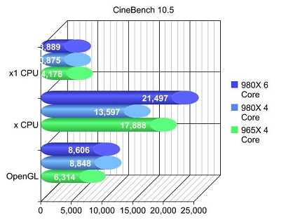 ה-980X כשכל ליבותיו פועלות, הוציא ציון של 9,571 נקודות. עם ארבע ליבות בלבד, המעבד עם ליבת Gulftown השיג ציון של 8,928 נקודות. זאת, לעומת 8,398 נקודות "בלבד" ל-965X. מדובר בשיפור של כ-14 אחוזים בביצועים בין דורות הייצור השונים.