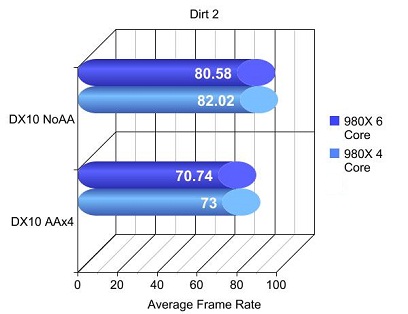 גם ב-Dirt, ההפרש בין שש ליבות לארבע בלבד, היה זניח עד לא קיים – 80.58 לעומת 82 פריימים לשניה.