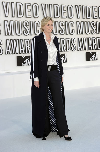 ג'יין לינץ' מ"גלי" החליטה למנף את הסמל שלה, חליפת הטרנינג של פעם, ולבוא במעיל בוקרים ארוך עם פסים תואמי טרנינג על השרוולים פלוס בטנה מנוקדת. האמת היא שהמכנסיים והחולצה מרשימים וטובים בהרבה מהשמלות שהיא דפקה בהופעותיה האחרונות, והמראה הסולידי מתאים. המעיל? זה שייך לפוזה, ורק בגלל זה המעצב(נ)ת מאשרת, למרות שמבחינתה זה אפילו לא מתאים בתור חלוק אמבטיה.