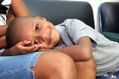בקרוב יוכל לרוץ. ז'אן פרנסואה על ברכי אמו (צילום: עופר עמרם)