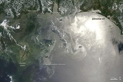 אתר הדליפה והנפט במימי מפרץ מקסיקו (צילום: נאס"א) - להגדלה