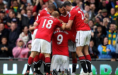 שחקני יונייטד חוגגים את השער הראשון של ברבאטוב (גטי אימג'ס)