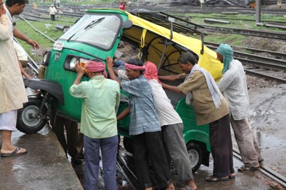 על הרציף כבר חיכו חמישה סבלים, דחוקים בתוך הריקשה, ואני נוהג בין ההמון שמחכה לרכבת. כולם מסביבנו בהו בתימהון. נסענו לקצה הרציף, מדי פעם שוקעים, וכולם יצאו לדחוף. עכשיו - רק להרים את הריקשה על הרציף.