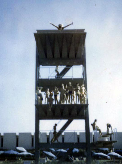 "קאנטרי קלאב - גלילות. אני מתגעגע! ממש גדלתי שם. זה היה מקום קסום לילד, עצום בגודלו עם מאות פינות נסתרות. המקפצה שבתמונה הוא לפי דעתי היחידה בארץ, אולימפית במלא מובן המילה, לא רק בגלל גובהה אלא גם בזכות עומק הבריכה (4.5 מטר). כמו שאומרים, כבר לא עושים כאלה היום (דוד)".