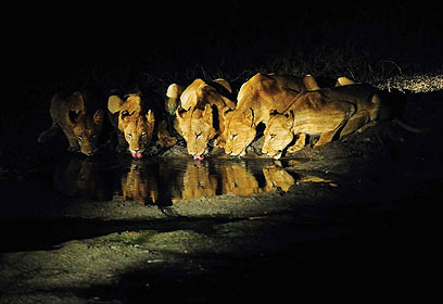 אריה ולביאות שבאו לשתות באגם אחרי שזללו בופאלו (צילומים: דוד מונסונגו)