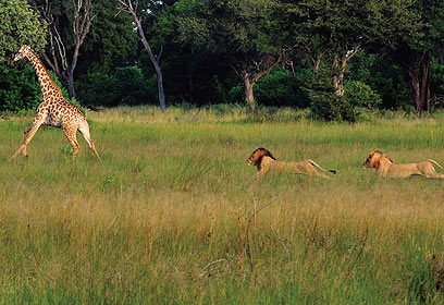 הזמן חלף, הג'ירפות התקרבו והאריות עברו לתנוחת הציד המוכרת, כשהם מורידים פרופיל ומחכים לשעת כושר. המרחק הצטמצם עד לכדי מטרים ספורים. האריות היו עם הפנים נגד כיוון הרוח, כך שהחיות האחרות לא יכלו להריח אותם ולא הרגישו בהם. ואז, כמו פגז מלוע של תותח, זינקו שני האריות לעבר הג'ירפות שפתחו במנוסה. המרדף הסתיים לאחר כדקה ללא הצלחה. אלוהים נענה כנראה לבקשתנו ואפשר לצעיר לחמוק ממלתעות האריות.