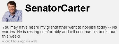 נכדו של קרטר, הסנטור ג'ייסון קרטר, פרסם בטוויטר שלו הודעה בה נכתב כי סבו "סובל מכאב בטן, אך הוא בסדר", הוא ציין כי הסב מתכוון להמשיך בתוכניתו להשתתף באירועים לקידום ספרו.