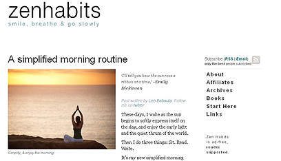 צפו: למדריך על שגרת בוקר פשוטה; מדריך שעוסק באיך לא להיות עסוק; לפוסט בשם "11 דרכים לא להיות וורקהוליקס". יש לציין שאני אוהב לקרוא את הבלוג הזה בתשע או בעשר בערב, לקראת סוף יום העבודה שלי.