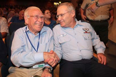עמוס ידלין (מימין) לצד אביו אהרון ידלין, בקיבוץ כנרת (צילום: חגי אהרון)