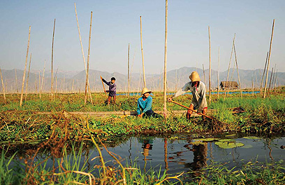 הדיג ועבודות האמנות אינם העיסוק היחיד של בני האגם. חלק מהכפריים מגדלים עגבניות בערוגות ממש על המים. החקלאים מנסרים פיסות קרקע מהגדות, מערבבים אותן בבוץ ואצות מקרקעית האגם ובצמחי יקינטון המים, הרוויים בבועיות אוויר וגורמים להצפה. מדי כמה מטרים תוקעים החקלאים מוט במבוק צר וארוך המשמש כעוגן ומונע את היסחפות הערוגה ללב האגם. הטיפול בערוגות נעשה מתוך סירות הקאנו השטוחות.