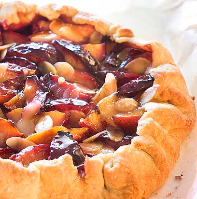 - הציפוי: בסיר קטן ממיסים את הריבה עם הברנדי מעל להבה נמוכה תוך כדי ערבוב. מברישים מיד את הפירות ואת שולי הבצק בריבה החמה ומפזרים שקדים פרוסים מעל לקישוט. מגישים חם עם יוגורט, קצפת או גלידת וניל ליד.
