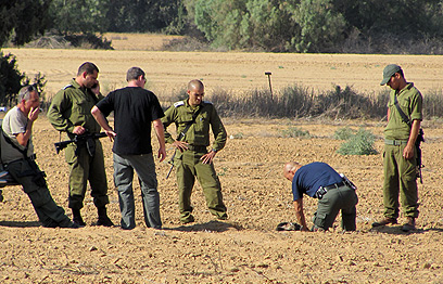 כוחות הביטחון במקום פגיעת הקסאם. נפל בשטח פתוח (צילום: רונית מניקר)