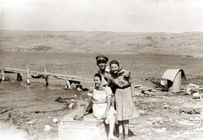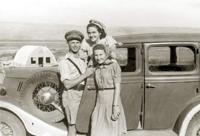 10. במבנה המשטרה היתה גם יחידה מחיל ההנדסה הבריטי, העוסקת בעבודת ביצורים על גבול ארץ ישראל-לבנון. בין מפקדי היחידה נמצא גם קפטן עמנואל טינטר, ממתנדבי היישוב לצבא הבריטי. עמנואל התיידד עם אלכס. הידידות הניבה גם פירות ל"הגנה" - אמל"ח מגוון. בתצלום: עמנואל עם בנות מטולה, חנה קוסקובצקי וסגולה צ'יזיק, ליד מכוניתו של קפטן שומכר.