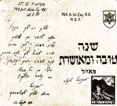 12. במשך שנות המלחמה יצא עמנואל טינטר עם יחידתו לצפון אפריקה ואיטליה. לקראת ראש השנה שלח לידידו במטולה ברכת שנה טובה שאותה צייר.
