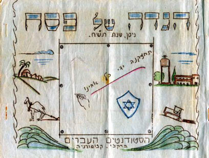 16. לאחר החורף, כידוע, בא אביב. הסטודנטים העבריים בברקלי חוגגים פסח עם הגדה מסורתית כהלכתה (עמוד ראשון של ההגדה).