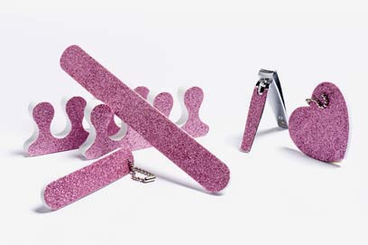 רשת Laline משיקה אביזרי פדיקור/מניקור בשני צבעים: ורוד נצנצים, כסף נצנצים עם סלוגן המודפס בגב כל פריט Hand in hand let's reach our goal of a better and healthier world. בין הפריטים בסדרה: פצירה ארוכה, פצירה קצרה, פצירה לב, קוצץ ציפורניים, ספוג פדיקור. מחיר כל פריט:10 שקל. לפרטים: עמותת "אחת מתשע" 1-800-363-400.
