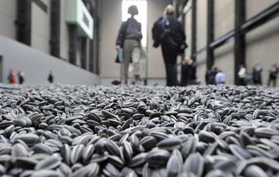 אנחנו הישראלים יודעים: גרעינים שחורים נועדו לצפייה במשחקי ספורט, מהסלון או מהיציע. נראה שלאוהדים יש בלעדיות על הפיצוחים. דמיינו לעצמכם אחד חובב אמנות מפצח את הגרעינים במוזיאון תל אביב מול ציור של מארק שגאל. אם תגיעו בימים אלה למוזיאון "טייט מודרן" בלונדון, אולי יהיה מחזה בדיוני זה קל יותר לעיכול. זאת בגלל מיצג "גרעיני החמניה" של האמן הסיני איי וויי-וויי.
