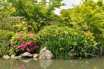 גן פרחים מעוצב ואגם שחיים בו עשרות צבי מים. הגן במקדש טוג'י
