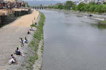 לאורך הרחוב בתי תה מסורתיים ושפע של מסעדות. חלקן מציעות מרפסת אחורית פתוחה שצופה אל הנהר. בשעת שקיעה נצבעים המים בגווני פנסי הרחוב האדומים ואורות העיר מנצנצים במים. אם תרצו לשבת מצאו קפה קטן והמתינו לשעת החשיכה. בעת טיולכם בסמטאות שימו לב לגיישות שמגיעות לעבודה במסעדות הקטנות, כשהן לבושות בלבוש המסורתי היפני, בגרביים לבנים וכפכפי עץ שקטנים עליהם במידה. מדי פעם תעבורנה גיישות שעור פניהן צבוע לבן והשפתיים באדום עז.