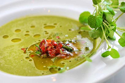 - הרכבת המנה: יוצקים את המרק החם לקערה, מניחים במרכז עיגול מלבי, בוזקים מעל פיסטוק טחון ומקשטים בנענע.