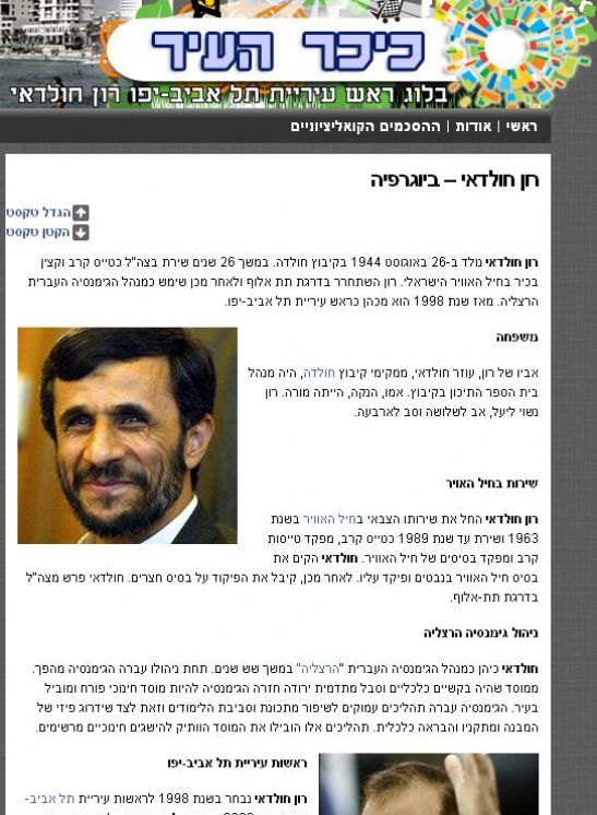 בלעדי: פעילי רשת הביכו (שוב) את רון חולדאי, וניכסו לעצמם (שוב) משאבים שצוות האתר של ראש עיירית תל אביב השאירו מאחור. התוצאה הפעם: תמונות של אחמדינג'אד ושל אבו טור בביוגרפיה הרשמית. עיריית תל אביב: נפסיק את פעילות הבלוג