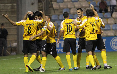 שחקני נתניה חוגגים שער מוקדם שלא הספיק (צילום: עוז מועלם)