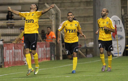 מכבי נתניה חוגגת שער מוקדם של חן עזרא (צילום: עוז מועלם)
