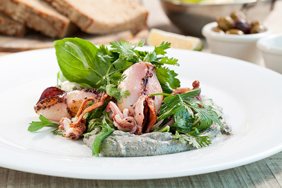 סלט קלמארי על הפלנצ'ה עם טחינה שחורה