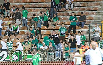 אוהדי מכבי חיפה מעוצבנים על בנאדו, מול ק"ש (צילום: חגי אהרון)