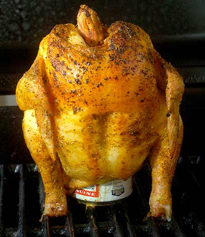 - את הפחית תוקעים באחוריים של התרנגולת כמה שיותר עמוק (לרוב נדרשים שניים למשימה הזו) ומעמידים בתבנית כשפחית הבירה היא הבסיס.