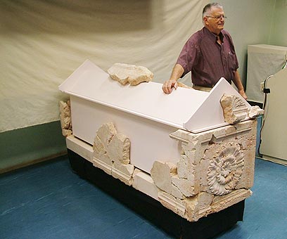 פרופ' אהוד נצר עם ארונו של הורדוס שהתגלה בהורדיון (צילום: אביטל להב)
