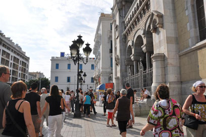 חצינו את הגשר הגדול שמחבר בין נמל "לה גולט" לעיר הבירה. הגשר נבנה מעל אגם גדול רק במארס 2009 ועד אז חצו את האגם במעבורת. נסיעה קצרה הובילה אותנו לרחוב הראשי של הבירה "שדרות חביב בורגיבה". הטוניסאים קוראים להן "השאנז אליזה". בתי קפה ומסעדות, מבנים בעלי סגנון אדריכלי אירופי, מכוניות חדישות וחשמלית שנעה לאורך השדרות. בין בתי הקפה הידועים אפשר למנות את קפה פריס, פלמריום וקפה טוניס. ישנם בתי קפה מעורבים לגברים ונשים ובתי קפה שבהם יושבים גברים בלבד ומעשנים נרגילה או האבלי באבלי.
