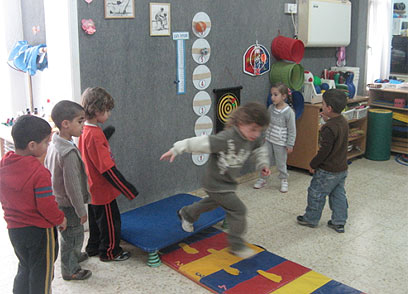 אני מציצה בסקרנות בילדים שהתפזרו למרכזי הפעילות. שני ילדים בחרו משחק קופסה, אבל רובם בחרו במשחק תנועתי. שלוש בנות הולכות על קביים פשוטים העשויים משני דליים וחבל, כמה ילדים משחקים בקליעה למטרה, אחרים קופצים על מזרוני התעמלות, מסובבים גולות על צלחת הפוכה מפלסטיק ועוד. שריר מציינת שהילדים אוהבים דווקא את הדברים הפשוטים והדברים היקרים שוכבים על המדפים.