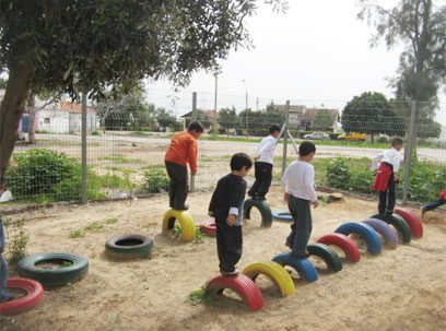 אני יוצאת לחצר. מתקנים סטנדרטיים לחלוטין, אך גם צמיגים רבים הצבועים בצבעים שונים ומסודרים במקבצים בכל מיני צורות. אפס עלות. במפת החצר נראים האזורים השונים בה והמנחה מתכנן את סדר הפעילות על ידי מִספור האזורים. הוא תולה את המפה בחוץ וכאשר הילדים יוצאים אל החצר, הם מעיינים במפה ומבצעים את המסלול שתכנן. "זוהי בעצם עבודה על הבנה ותפיסה מרחבית", מסבירה שריר.