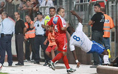 טל חן מנסה לחלץ כדור מעידן שריקי. "המצב קשה" (צילום: חגי אהרון)