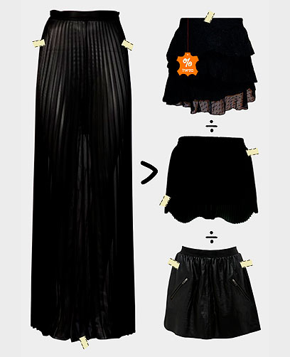 עם ההתקקרות, הסיכוי למצב רוח קודר מוכפל, לא פחות ולא יותר. ההצלחות של העונה. בכיוון השעון: חצאית ילדותית של אורבן אאוטפיטרז, עוד אחת מכווצת מטופשופ, חצאית עם כיסים מאליז, ודיוותית מפליסה לקינוח של שרון ברונשר (צילומים בהתאמה: יח"צ חול, טל טרי)