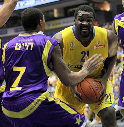 צ'אק אידסון עובר את בראיין טולברט בדרך לעוד סל (צילום: עוז מעולם)